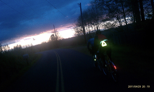 Backroads meander, and randonneuring rules require controls whenever there might be a short-cut, so we stopped at various intersections and took photos of ourselves with street signs as proof of our passage. Past Eaglemount, an exhilarating descent brought us to the Route 101, the main highway around the Olympic Peninsula. Through careful map reading, we had charted a course along old roads that avoided the highway as much as possible. Even so, the first three kilometers on the highway shoulder already netted a flat on my rear tire: A long steel wire from an exploded truck tire had made short work of my tire and tube. I was able to limp onto the backroad, so we could change the tube in a tranquil setting while the sun vanished behind the hills to the west.