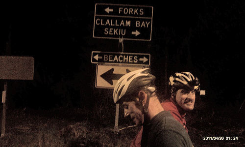 We rode through a winding valley, the trees along the road picked out in the periphery of our headlight beams. We passed through Pyscht, which was fast asleep at this hour. Another long climb followed, with another rain shower to keep us awake. A fast descent brought us back to the main road, and on to Forks. During our first Flèche, we had spent an inordinate amount of time at the only convenience store of this logging town due to fatigue and cold, but tonight, we were dressed for the weather. Our stop was efficient, and quickly, we were back on the road.