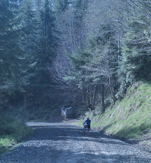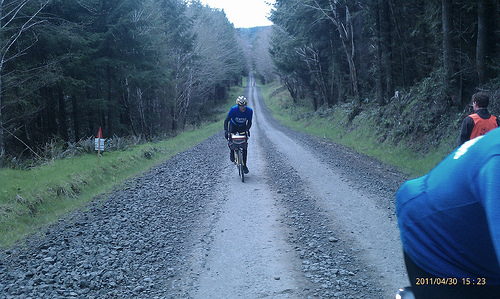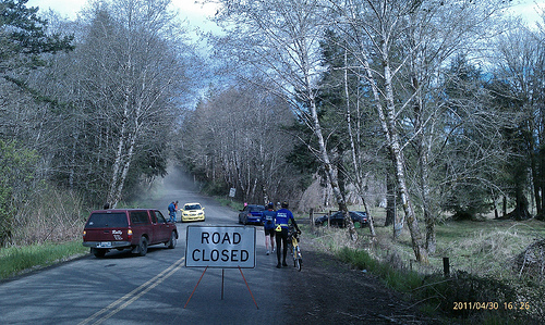 Our stop in Raymond was a little longer than planned, but we knew it would be our last stop until the end of the official 24-hour ride. We now faced the “pièce de résistance” of this Flèche, the Willapa Hills with their steep climbs. We had selected a route that included about 20 km of gravel roads as a “back-door” way into Olympia, which otherwise is approachable only on major highways. The road started to climb before we even left Raymond, but we felt strong after the long “recovery” along the ocean. After a kilometer or two, we turned off the highway onto a lovely little road that roller-coastered through the hills at times, and at others followed a beautiful valley with green meadows and budding trees. At our next turn-off, there was a small sign: “Road closed by order of residents.” We almost missed it, and I turned around to make sure I had read it correctly. It did not look very official, so I thought it might be the rural equivalent of a block party, and we continued unfazed. A few miles down the road, there was a road block. We stopped, and a lady told us: “The road is closed for a car rally until 6 p.m. You can’t continue.” Six o’clock! That would wreak havoc with our plans. It was three o’clock now... There was no detour route, either, except going back to Aberdeen and adding 80 km to our ride. Inspired by desperation, we pleaded our case: “You see, we are doing something like a rally on our bikes. We have to, absolutely have to, complete this 24 hour ride. When will the rally cars come through? And how long is this stage?” The lady replied: “The first ones will come in an hour, and it’s 6 miles long.” – “We can easily do 6 miles in an hour, so please, please, please, can you just look the other way, while we go through.” To our surprise, the lady gave in: “We’ll just say you passed without stopping, so quickly that I could not do anything.”