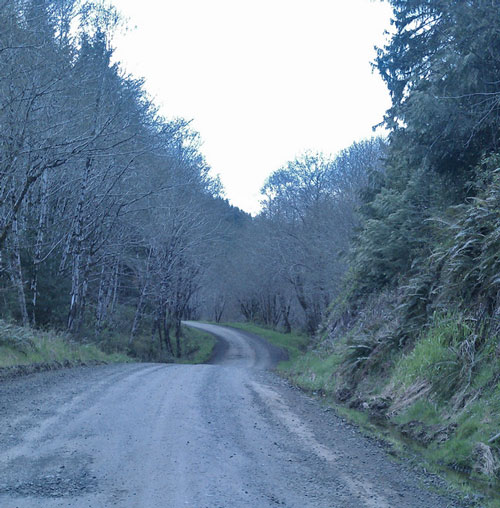 We rolled along at a good clip on Highway 101, the main road around the Olympic Peninsula. The road surface was rough chipseal, while the shoulder was smoother. Hahn succumbed to the temptation of riding on the smooth shoulder. Almost immediately, he paid the price with a flat tire. From then on, we rode in the traffic lane. There were few cars on the road, so it was easy to move over when one approached from behind. Before long, we turned off the highway onto Hoquiam Road, a beautiful backroad that wound its way through the hills. We had scouted this alternative to the highway on Google Earth, and it turned out to be even nicer than we thought.