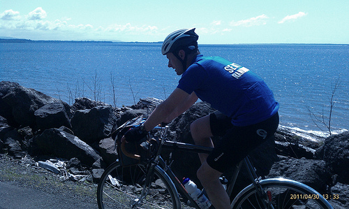 Ryan, Hahn and I met at a “healthy fast food” place for a quick dinner, before boarding the ferry to Bainbridge Island. The ferry ride allowed us to digest our dinners, and leave the bustling city behind. On the other side, we waited for what seemed like an eternity until the ferry had disgorged its cars. After having our cards signed at a bike shop, we clipped into our pedals at 5:31.