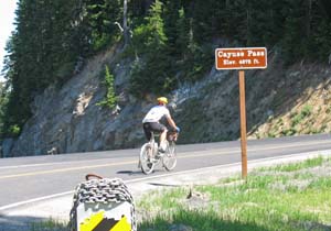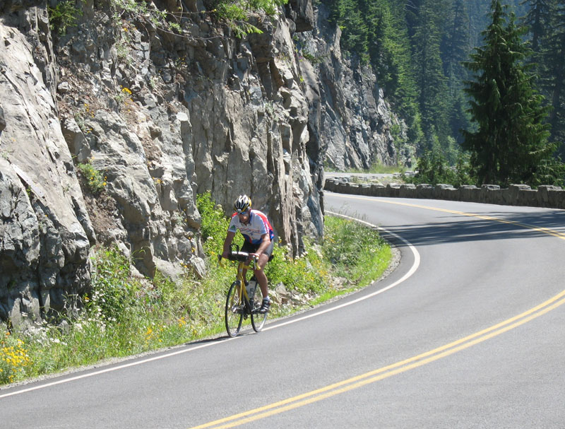 Mark climbs Cayuse Pass near Mt. Ranier. |