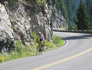 | After we passed the junction with Steven's Canyon Road, I was truly on familiar ground. The Cayuse Pass climb is not steep, but it is almost unrelenting. As on some of the earlier climbs, we each set our own pace, Jan ahead, I in the middle, and then Ryan. This was really great for me because I could (selfishly) reason, "As long as I'm ahead or Ryan, I'm not the one responsible for our team's pace." I rode steadily, savoring the shade of the huge old-growth trees, and never felt quite hot enough to dunk my head under any of the small waterfalls that periodically cascaded down the rocky bank on my right. When my sleepiness returned, I stopped at a pull-off and lay down on the cool, shaded blacktop. Ryan caught up quite quickly, re-emphasizing for me how much difference there is between stopping and slowing down. I re-mounted my bike and after a few words with Ryan fell back into my prior rhythm. |