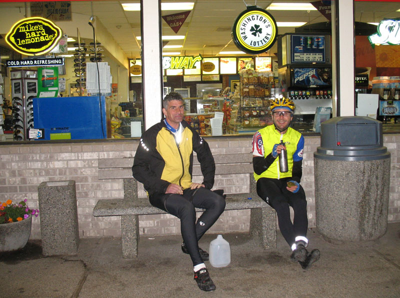 We make a quick stop for fluids at the Ravensdale store. I feel much worse as soon as I stop pedaling, but I force down some maltodextrin and cold water. Jan dumps some refrigerated water into the helmet vents on top of my head, and the icy shock is the most pure pleasure I've felt in at least twelve hours.