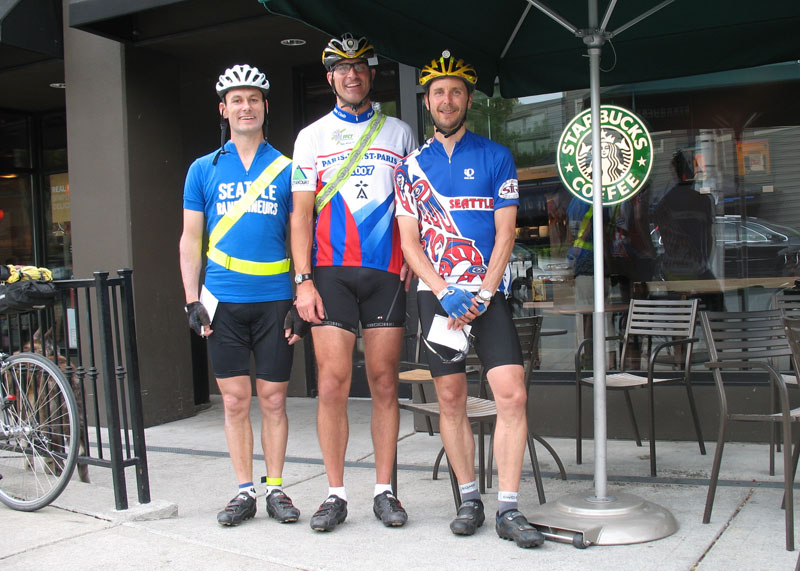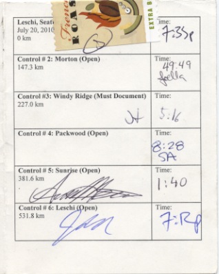 Then, after dinner on a Tuesday evening, Jan rode to Mark's house, the two rode to Ryan's, and all of us entered the coffee shop in Leschi at 7:20 p.m. At 7:33, we had our cards signed and set off into the warm evening.