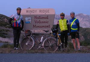 We reached the junction with Forest Road 99 sooner than anticipated, perhaps because the different sensations of riding at night made the time pass more quickly. Almost unnoticed by us, twilight now bathed the landscape with a faint light, making the descent from Independence Pass much easier, as we could see the road ahead of our headlights' beams. On the next climb, I almost ran over a porcupine that was resting on the warm pavement and scampered off confusedly as our bikes approached. At 5:16, we reached Windy Ridge and looked upon Mount St. Helens' crater in the pink morning light. A single camping van was parked in the parking lot, but everybody appeared asleep, or already out hiking, so we had this moment to ourselves.