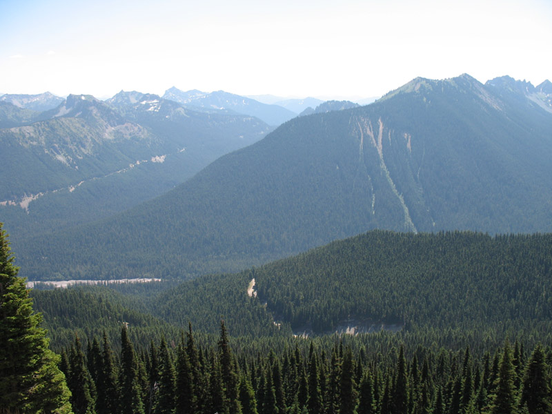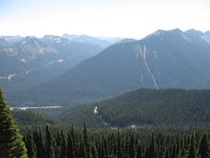 Mark and Ryan pulled off at a campground to refill their bottles, while I recovered a water bottle and four bottles of Ensure meal replacement drink that I had stashed on the way up, inside the guard rail of a bridge. I had left the food there on the way up, a few hours earlier, as much to lighten the bike as to improve its handling on the steep climb. (My Alex Singer was not designed for a heavy handlebar bag.) The sun was shining brightly as we turned onto the farm road in the river valley. The main highway was flatter and smoother, but this road was more enjoyable, and we were confident that we could spare a few minutes to savour this road. We reached Packwood and settled into the cafe for 20 minutes of welcome rest, our first real stop since leaving Seattle 13.5 hours ago. Having made good time since Windy Ridge, we were 50 minutes ahead of schedule. Having covered almost two thirds of the distance, we just had to climb Cayuse Pass and Sunrise, and then return to Seattle on this glorious summer day. |
